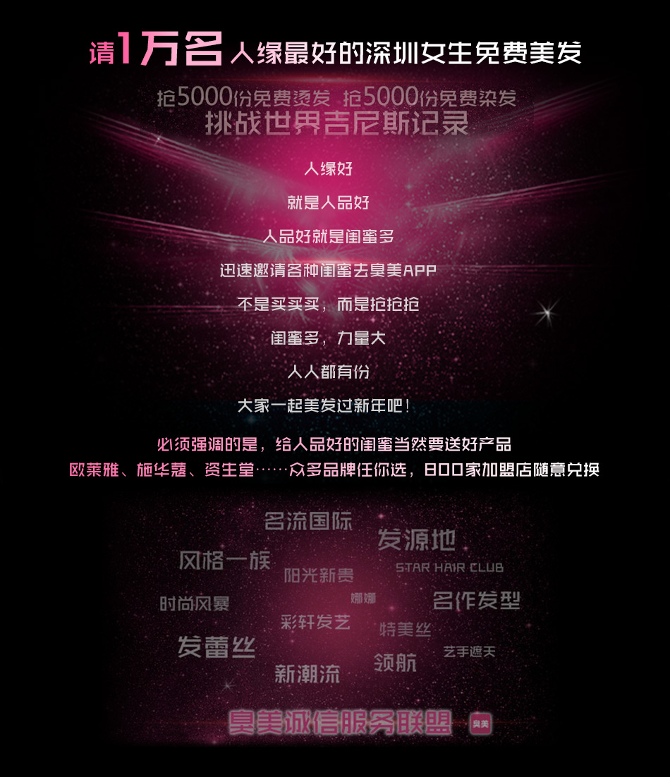 當(dāng)時(shí)鐘從2014年跳到了2015年,有多少人對(duì)著天空許下了從頭開(kāi)始的愿望?現(xiàn)在,正有一個(gè) 從“頭”開(kāi)始的機(jī)會(huì),擺在你的面前,這就是由知名美容美發(fā)行業(yè)O2O領(lǐng)導(dǎo)品牌“臭美美發(fā)”所發(fā)起的2015深圳“臭美之夜”首屆美發(fā)節(jié)活動(dòng)。