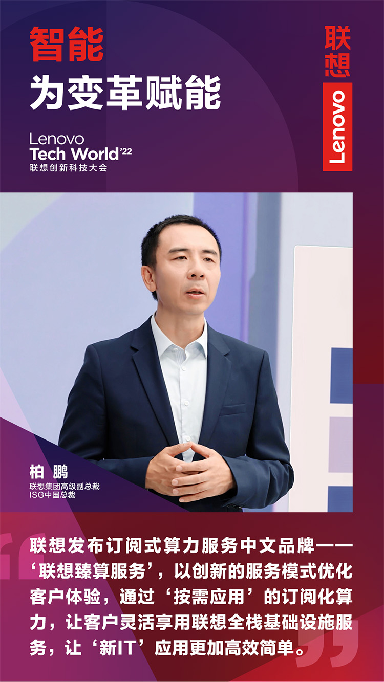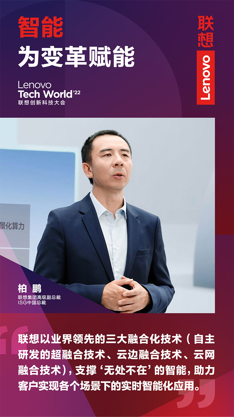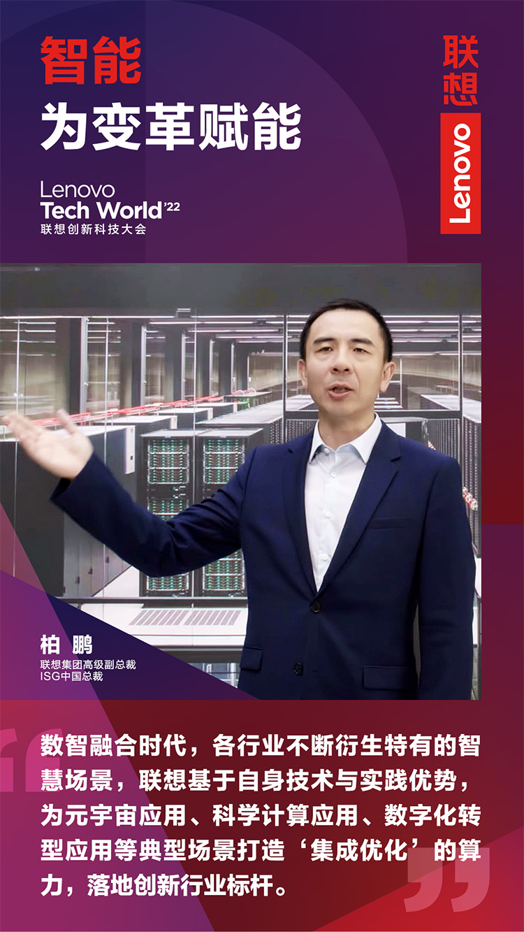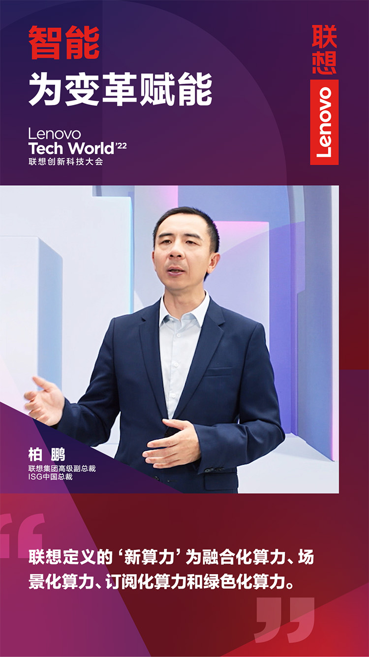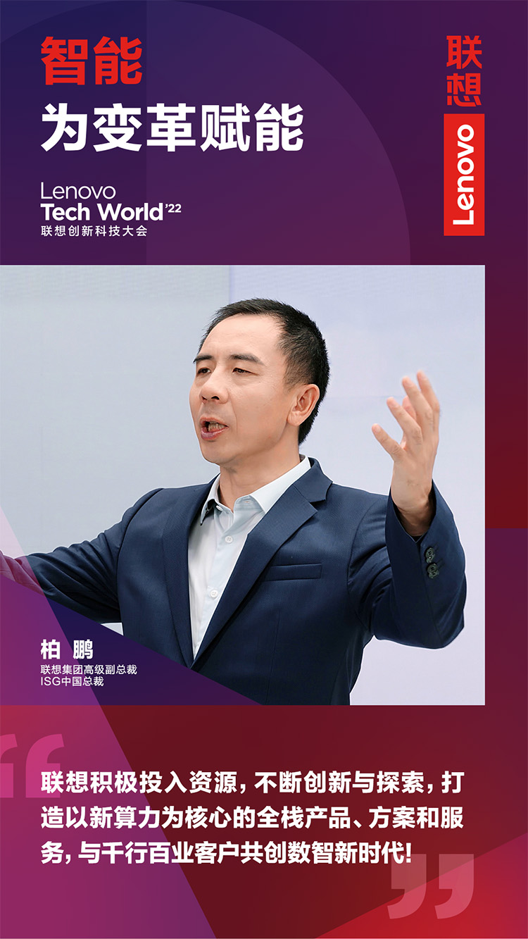 11月9日,以“智能,為變革賦能”為主題的2022聯(lián)想創(chuàng)新科技大會(Lenovo Tech World)成功舉辦。主論壇上,聯(lián)想集團高級副總裁、ISG中國總裁柏鵬發(fā)表《新算力,創(chuàng)造數(shù)智新時代》主題演講。